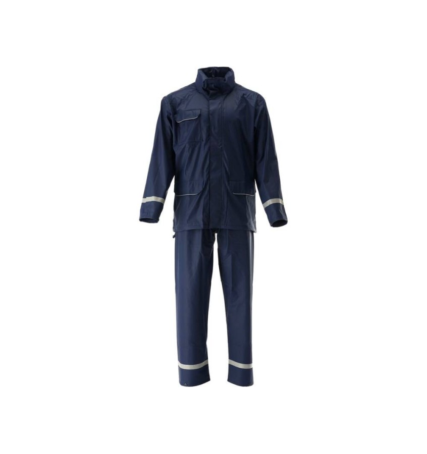 Komplet przeciwdeszczowy 2-częściowy YT-79710 marki Yato z wszytymi czterema liniami odblaskowymi na nogach i rękawach o szerokości 25 mm. Kurtka z trzema kieszeniami i regulowanym kapturem, spodnie z rozciągliwą gumką w pasie oraz ze szczelinami po bokach przez które możemy sięgnąć do kieszeni spodni. Materiał typu trykot wykonany z nici poliestrowych z dodatkową warstwą poliuretanu to połączenie wodoodporności ze swobodą ruchu oraz wysoką odpornością na rozdarcie.