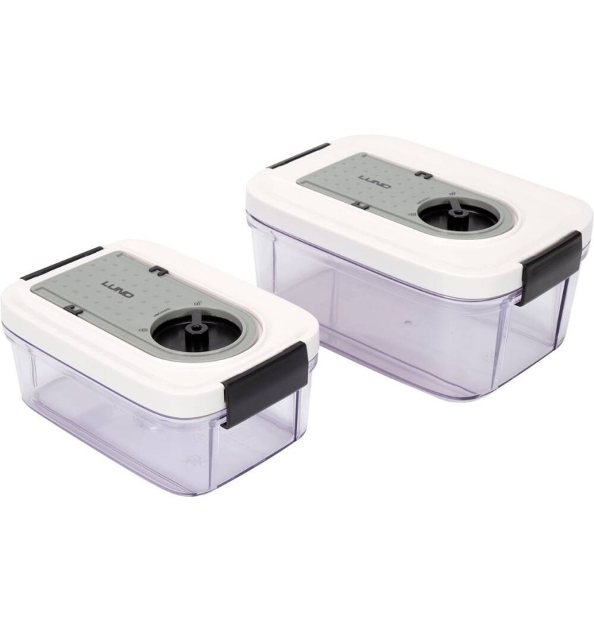 Zestaw dwóch pojemników próżniowych marki LUND o pojemności 0,75l i 1,5l. Wysokiej jakości materiał gwarantuje trwałość, możliwość odgrzewania żywności w mikrofalówce oraz mycia opakowania w zmywarce. Dodatkowym atutem jest możliwość zaznaczenia daty na pokrywie.