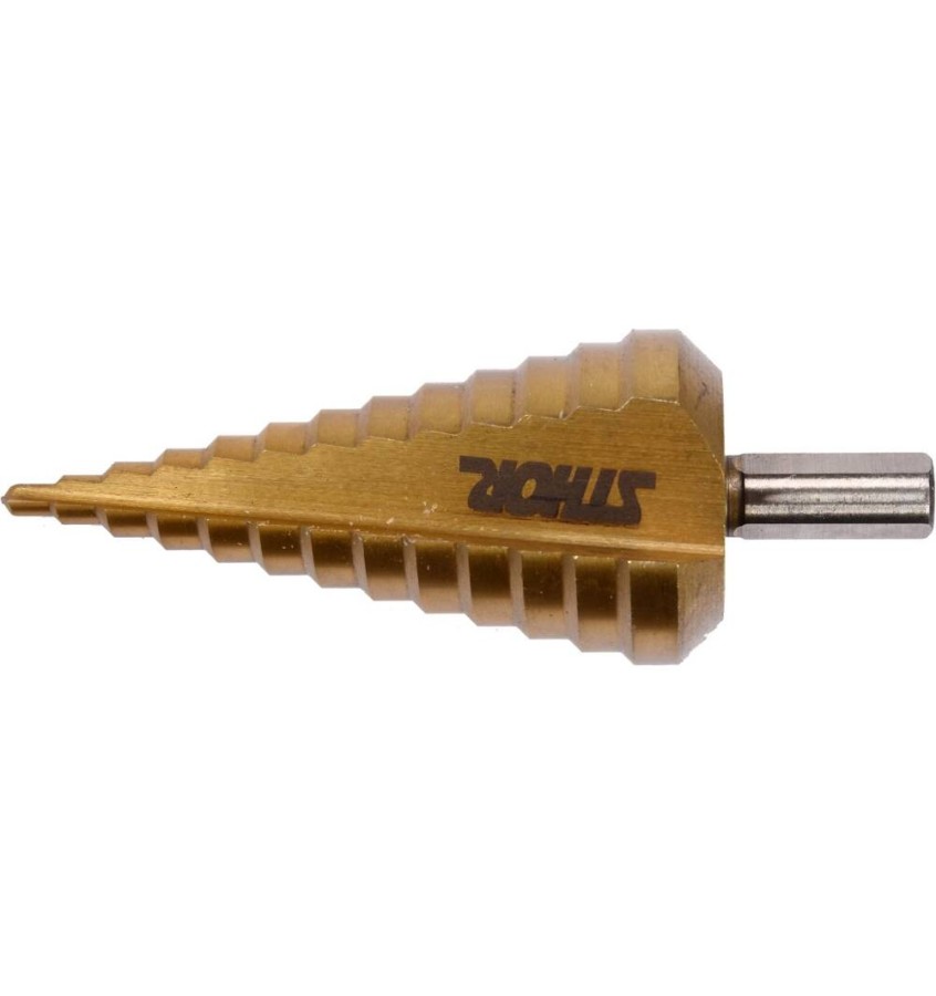Wiertło stopniowe marki przeznaczone do wiercenia w wysokogatunkowej stali nierdzewnej, konstrukcyjnej i walcowanej na zimno, w metalach kolorowych, blachach stalowych, tworzywach sztucznych.