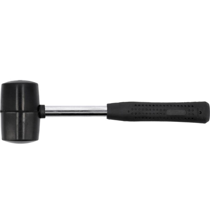Młotek wykonany z twardej, czarnej gumy, oprawiony na trzonku ze stalowej rurki, odpornym na uszkodzenia.