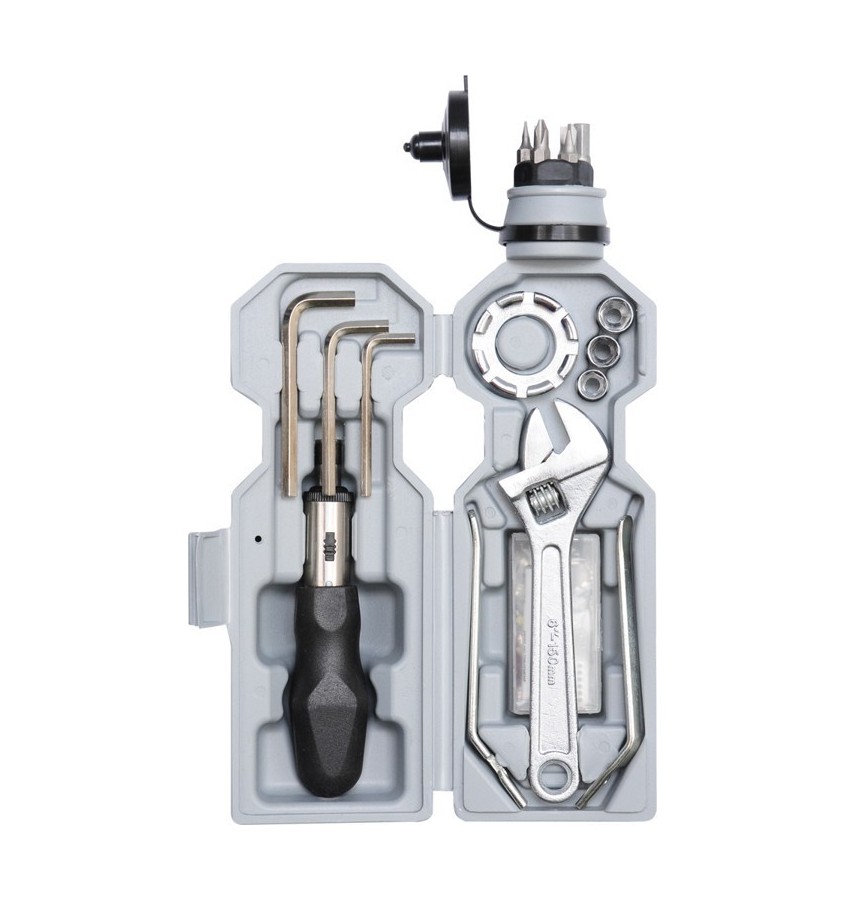Praktyczny zestaw podstawowych narzędzi rowerowych umieszczony w opakowaniu o kształcie bidonu. Zestaw zawiera 18 praktycznych narzędzi. Do zestawu dołączono koszyk do zapiecia bidonu.