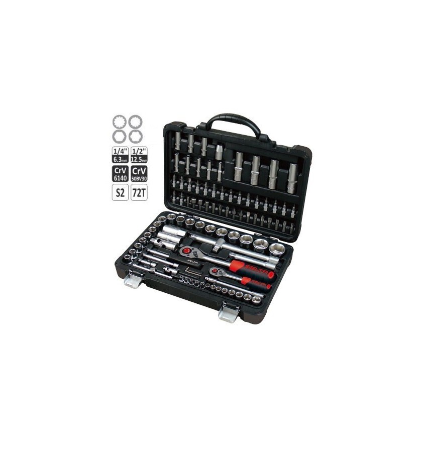 W zestawie znajduje się 18 nasadek 1/2" w rozmiarach: 10-11-12-13-14-15-16-17-18-19-20-21-22-23-24-27-30-32 mm, silne grzechotki 72 zęby w rozmiarze 1/2" i 1/4", przedłużki, nasadki 1/4": od 4 do 14 mm, nasadki długie 1/2" i 1/4" oraz bity i klucze trzpieniowe na 1/4".