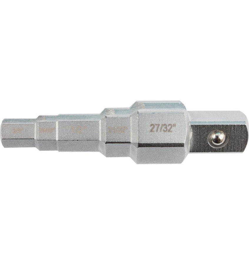 Klucz stopniowy o rozmiarach 3/8' (9,6 mm) / 29/68' (11,6 mm) / 1/2' (12,6 mm) / 21/32' (16,4 mm) / 27/32' (21 mm) z napędem 1/2' wykonany z wysokogatunkowej stali CRV.