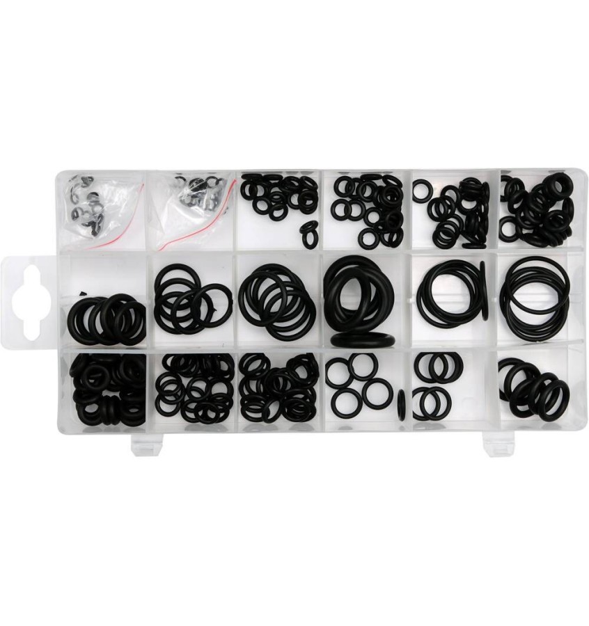 Praktyczny zestaw 225 O-ringów gumowych. Zawiera mix 18 różnych rozmiarów. O-ringi wykonane są z gumy odpornej na czynniki agresywne takie, jak paliwa, oleje i chemikalia oraz wysoką temperaturę. Praktyczne opakowanie pozwala na łatwy dostęp do dogodnego rozmiaru.