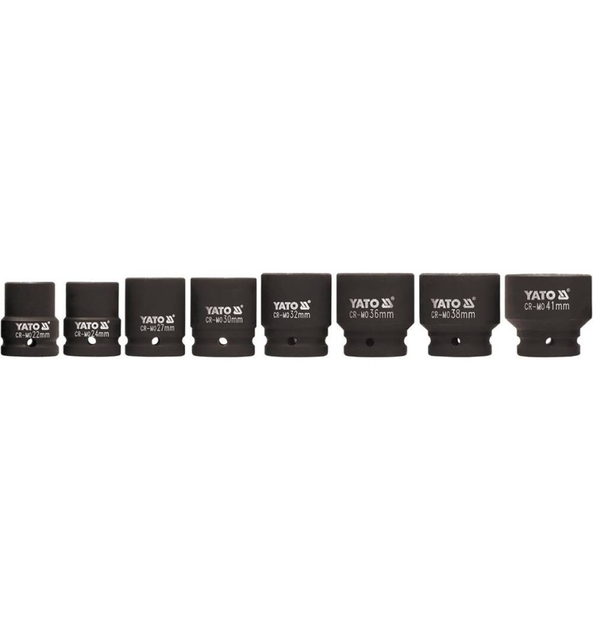 Nasadki udarowe 3/4' marki Yato - komplet 8 sztuk. Specjalistyczne nasadki udarowe, współpracują z urządzeniami pneumatycznymi, które pracują w bardzo ciężkich warunkach pod zmiennymi obciążeniami.
