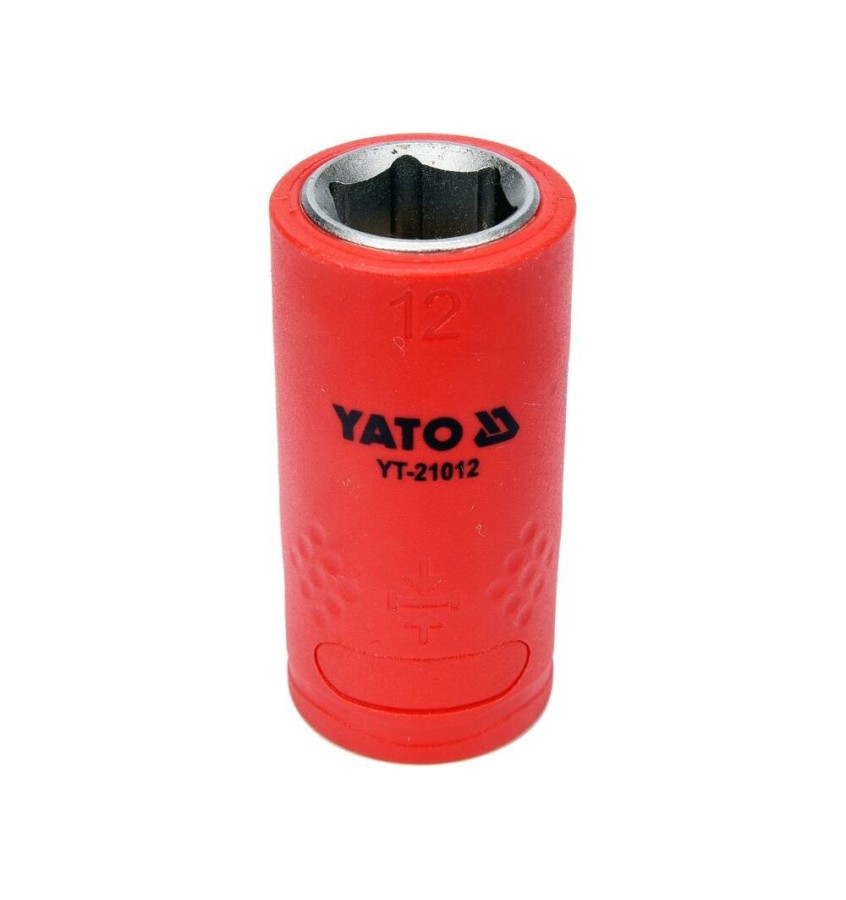 Izolowana nasadka marki YATO YT-21012. Wykonana z wytrzymałej, narzędziowej stali chromowo-wanadowej CrV. Wielokomponentowa rękojeść z certyfikatem VDE zapewnia izolację do 1000 V, dzięki czemu narzędzie może być stosowane podczas pracy przy instalacjach niskonapięciowych.