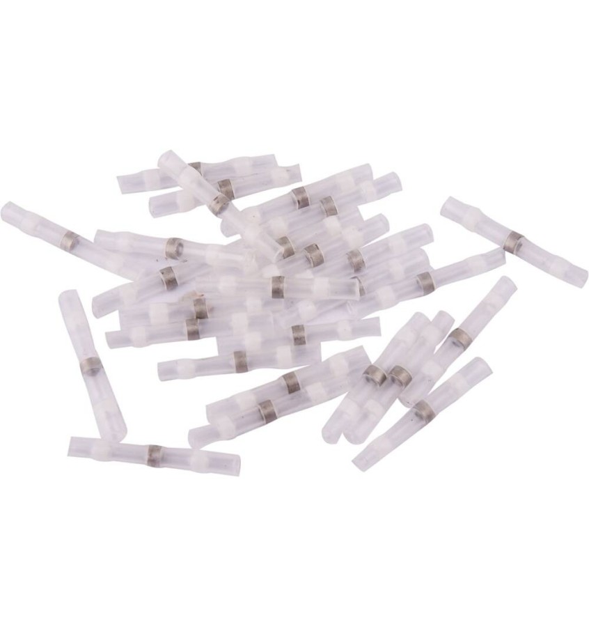Przezroczysta rurka termokurczliwa YT-81440 z pierścieniem cyny na środku oraz dwoma pierścieniami kleju termicznego po bokach, który dodatkowo uszczelnia połączenie.