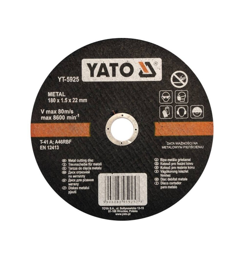Tarcza do cięcia metalu marki YATO wykonana z wysokogatunkowego materiału ściernego o odpowiedniej twardości i granulacji.