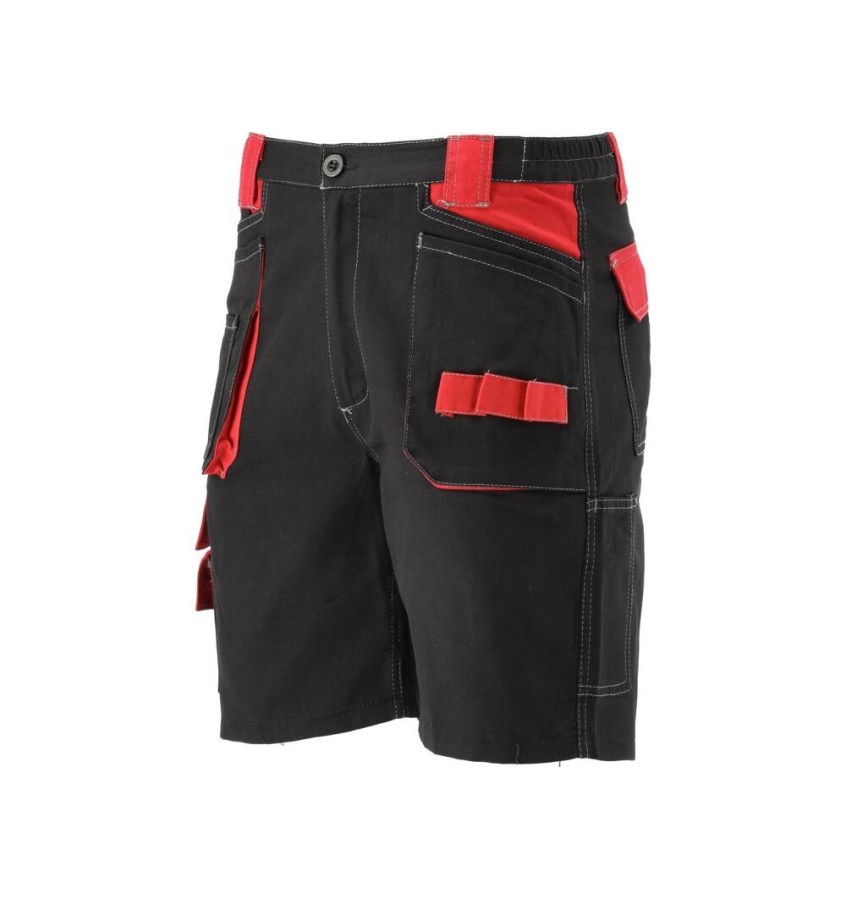 Spodnie robocze krótkie rozmiar XXXL, uszyte z odpornego na rozdarcia materiału na bazie 100 % bawełny. Kolor czarny z czerwonymi dodatkami. Posiadają dwie duże, naszywane z przodu i dwie z tyłu oraz na nogawce specjalną kieszeń na telefon komórkowy. Pas ze szlufkami i wszytą gumą ściągającą.