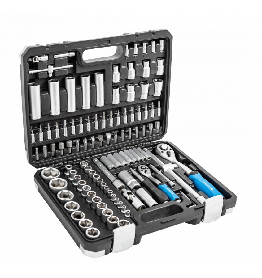 Kompletny zestaw 108 elementów składający się z grzechotek, nasadek, końcówek wkrętakowych