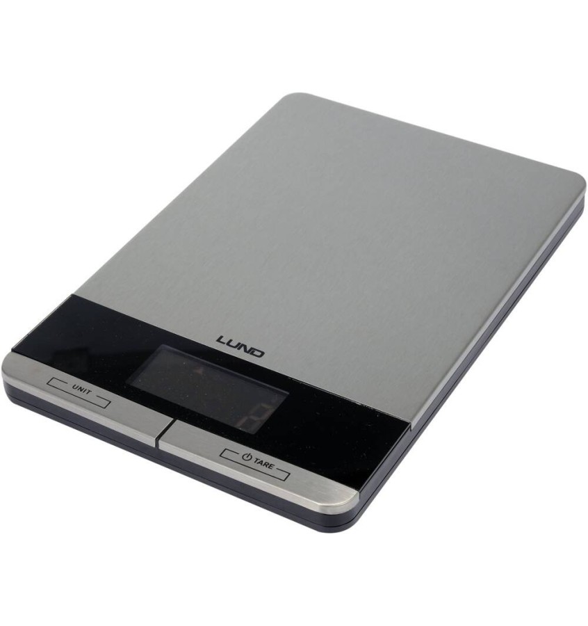 Waga kuchenna LUND z płytą wykonaną ze stali nierdzewnej. Wyposażona w czytelny wyświetlacz LCD pokazujący 4 jednostki wagi do wyboru oraz wskaźniki przeciążenia i niskiego poziomu baterii. Maksymalne obciążenie wynosi aż 5 kg.