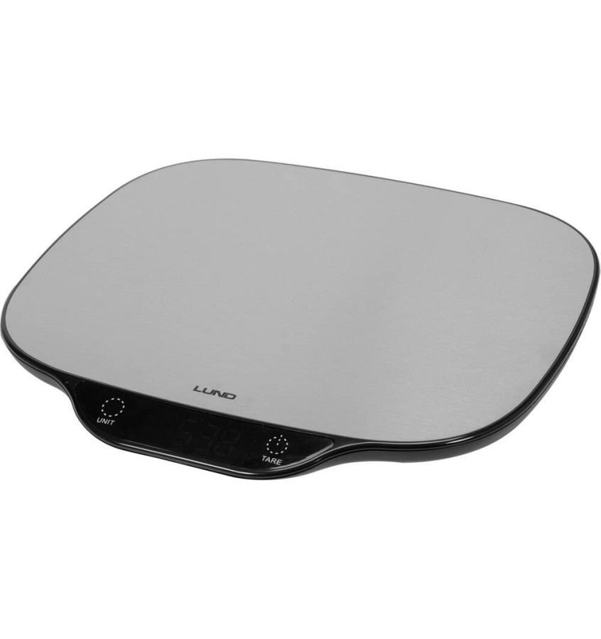 Waga kuchenna LUND z dużą płytą wykonaną ze stali nierdzewnej. Wyposażona w czytelny wyświetlacz LCD pokazujący 3 jednostki wagi do wyboru oraz wskaźniki przeciążenia i niskiego poziomu baterii. Waga wyposażona w cztery wysokiej jakości czujniki tensometryczne. Maksymalne obciążenie wynosi aż 5 kg.