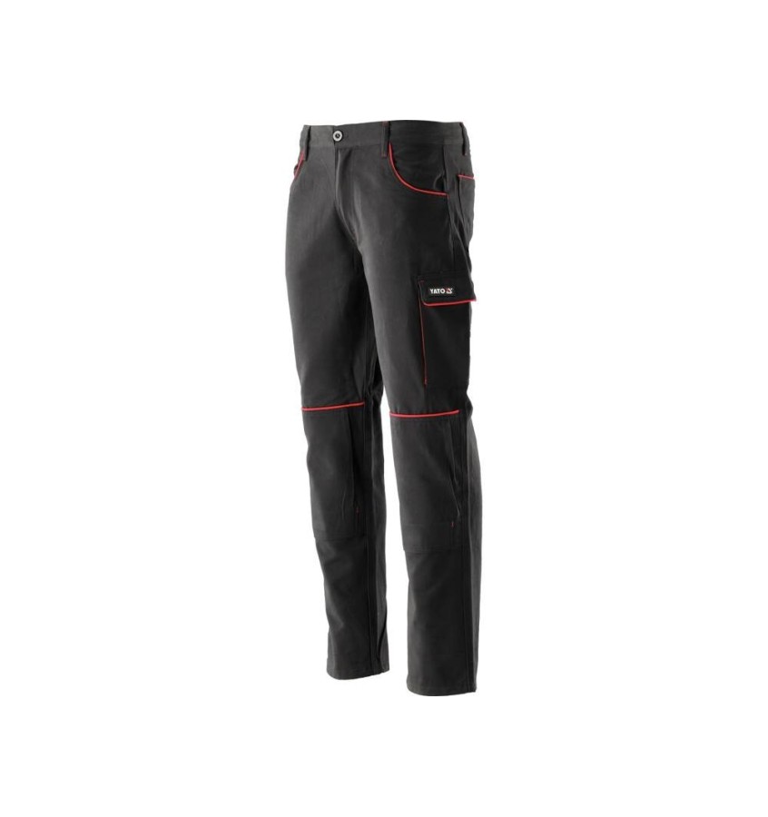 Siedem kieszeni, w tym jedna z patką z zapięciem na rzep oraz pętelka na młotek, pomoże w organizacji pracy. W pasie z tyłu wszyta guma ściągająca. Na kolanach kieszenie na nakolanniki z zapięciem na rzep. Spodnie w ciemnym kolorze z czerwonymi liniami, które oprócz funkcji dekoracyjnej wzmacniają i chronią przed rozdarciem krawędzie otwartych kieszeni.
