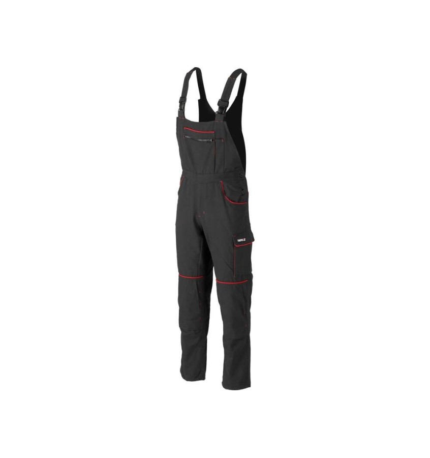 Dziewięć kieszeni, w tym duża kieszeń w okolicy piersi z zamknięciem na zamek oraz pętelka na młotek, pomoże w organizacji pracy. Materiałowe szelki z regulacją oraz elastyczną taśmą z tyłu. Po bokach guziki z regulacją szerokości w pasie, a z tyłu wszyta guma ściągająca. Na kolanach kieszenie na nakolanniki z zapięciem na rzep. Spodnie w ciemnym kolorze z czerwonymi liniami, które oprócz funkcji dekoracyjnej wzmacniają i chronią przed rozdarciem krawędzie otwartych kieszeni.