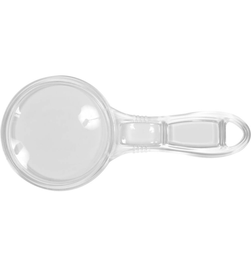 Lupa wykonana w całości z akrylu. Waży zaledwie 18 gramów. Oferuje dwa powiększenia. Pierwsze x3 z okrągłej soczewki o średnicy 50 mm. Drugie x6 z soczewki o wymiarach 10 na 20 mm. Druga soczewka ma kształt zbliżony do prostokąta i jest umieszczona w uchwycie.