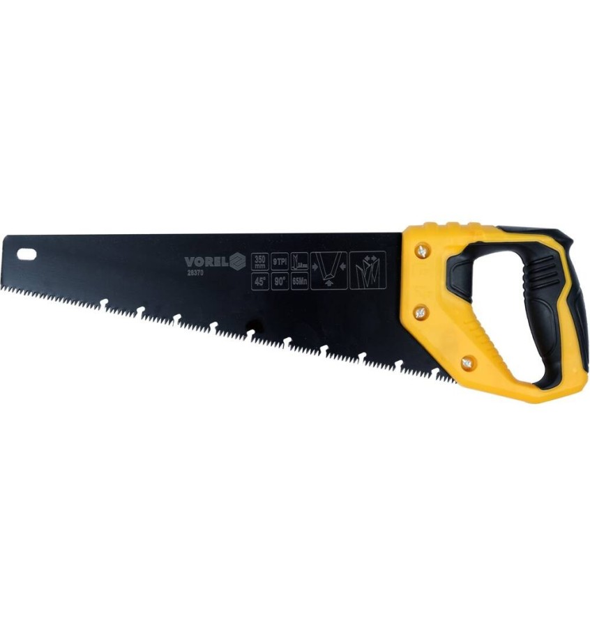 PIŁA PŁATNICA L-350 MM . PODZIAŁKA 9TPI. GRUBOŚĆ BRZESZCZOTA 0,9 MM. MATERIAŁ-STAL 65Mn . ZĘBY TRÓJSTRONNIE OSTRZONE W GRUPACH PO 9 NA CAL I PRZERWY DO USUWANIA TROCIN. RĘKOJEŚĆ ZAMKNIĘTA Z TWORZYWA Z APLIKACJAMI TPR , RĘKOJEŚĆ Z FUNKCJĄ KĄTOWNIKA 45 I 90 ST. POWIERZCHNIA CZARNA ELEKTROFORETYCZNA / SPOSÓB WYKOŃCZENIA /