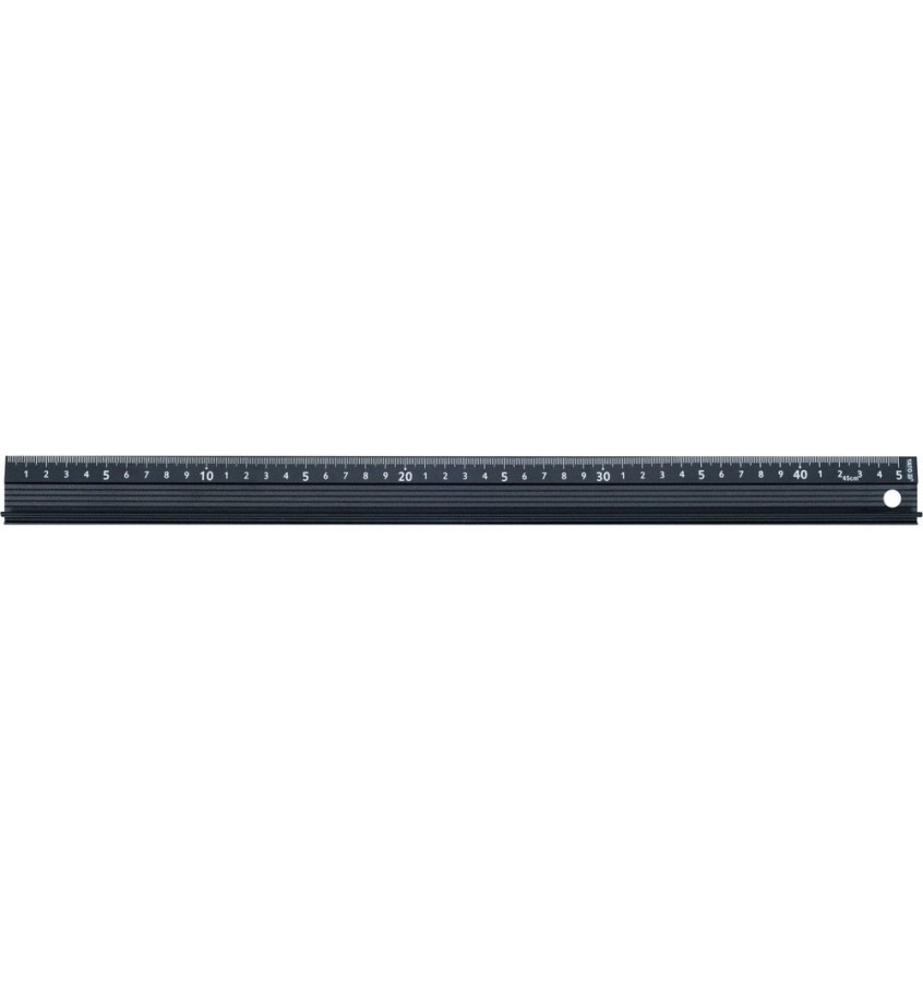 Aluminiowa linijka z profilem w górnej części, służącym jako bezpieczbny uchwyt do trzymania linijki podczas cięcia. Płaszczyzna dolna podklejona jest paskiem pianki, chroniącej mierzony materiał. Dla wygody użytkowania w linijce jest otwór do zawieszania.