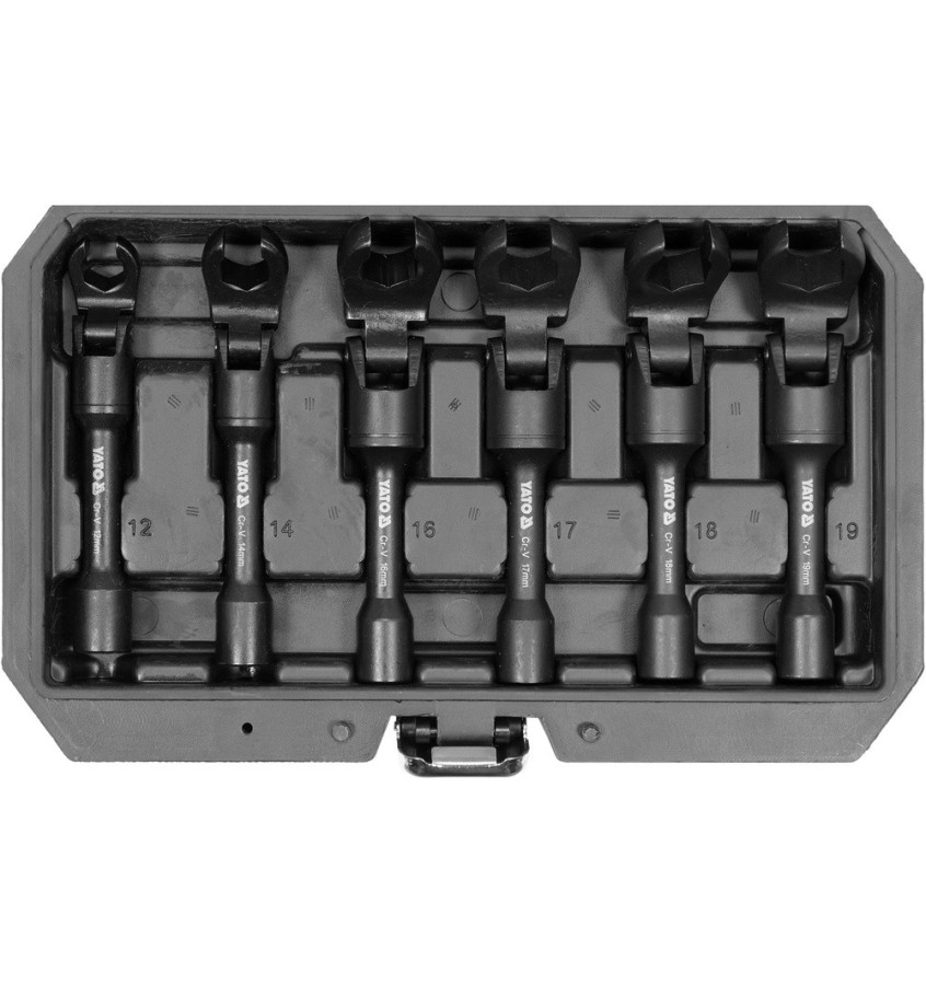 Zestaw otwartych przegubowych kluczy oczkowych. Doskonale sprawdzą się przy odkręcaniu i dokręcaniu czujników z przewodami elektrycznymi, odpowietrzników hydraulicznych, pneumatycznych czy paliwowych. Klucze są wytrzymałe dzięki wykonaniu ze stali 40Cr/CrV. Otwarte oczka oraz wygodny przegub znakomicie ułatwiają pracę w miejscach z ograniczonym dostępem.