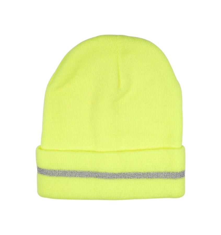 Czapka zimowa w kolorze żółtym z odblaskowym paskiem o szerokości 10 mm. Wykonana z ciepłej i elastycznej dzianiny. Rozmiar uniwersalny, świetnie dopasowuje się do każdego kształtu głowy.