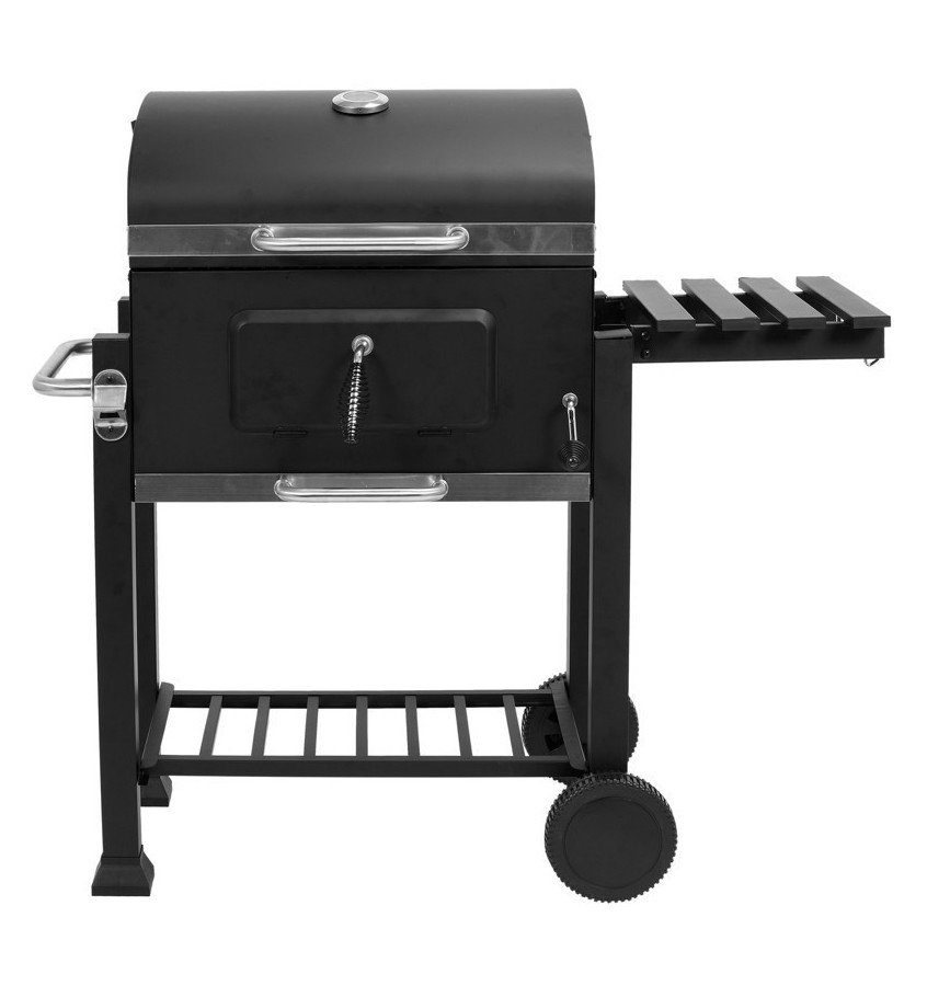 Wysokiej klasy grill ogrodowy do przygotowywania potraw na świeżym powietrzu, z regulowaną wysokością płyty na węgiel i termometrem.