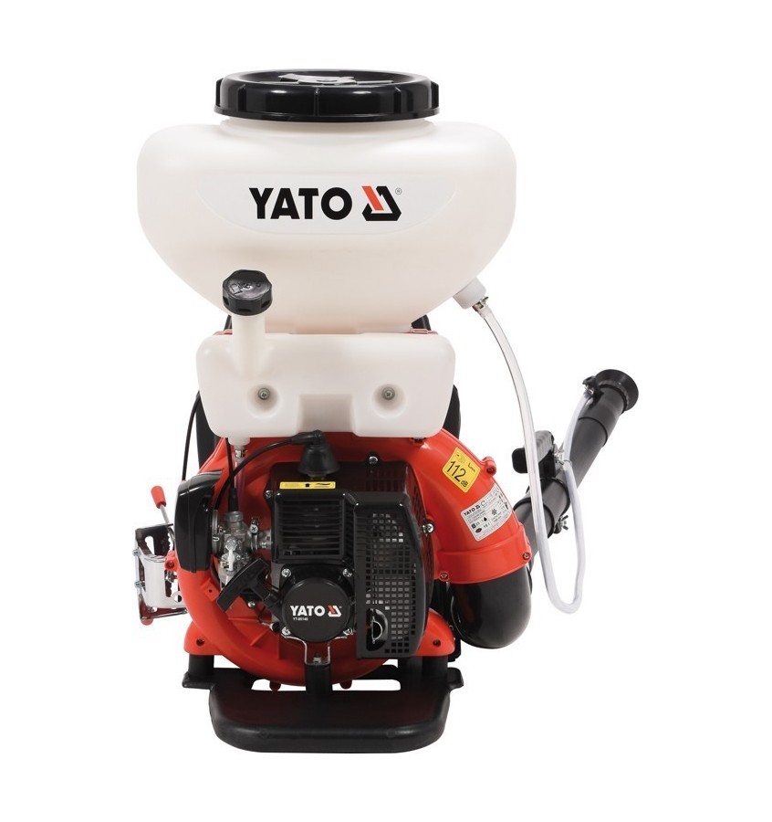 Opryskiwacz spalinowy YATO jest pomocnym i skutecznym urządzeniem stosowanym do ochrony roślin przed chorobami i szkodnikami, doskonale sprawdzi się na plantacjach, polach uprawnych, w ogrodach oraz parkach. Urządzenie wyposażone jest w praktyczny mechanizm umożliwiający szybkie przezbrojenie opryskiwacza, który można wykorzystać nie tylko do aplikacji substancji ciekłych, ale również do granulatu. Po ściągnięciu siatki z dyszy można urządzenie wykorzystać jako dmuchawę bez potrzeby kupowania dodatkowych akcesoriów. Zbiornik 16 l pozwala na ciągłą, efektywną pracę, natomiast duży wlew ułatwia napełnianie zbiornika. Duży zasięg opryskiwacza 12 m umożliwia oprysk nawet najdalej posadzonych roślin, do których opryskiwacz ręczny nie miałby dostępu. Opryskiwacz wyposażono w wygodny system nośny, co sprawia, że rozkład ciężaru podczas pracy jest komfortowy dla operatora.