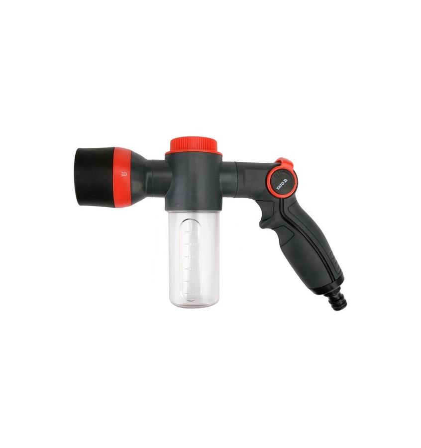 Solidny i funkcjonalny pistolet zraszający przeznaczony do podlewania roślin oraz mycia różnego rodzaju powierzchni. Wyposażony w 4 rodzaje strumienia wody oraz wbudowany dozownik na środki czyszczące lub nawozy płynne, zapewnia wszechstronność i wygodę użytkowania.