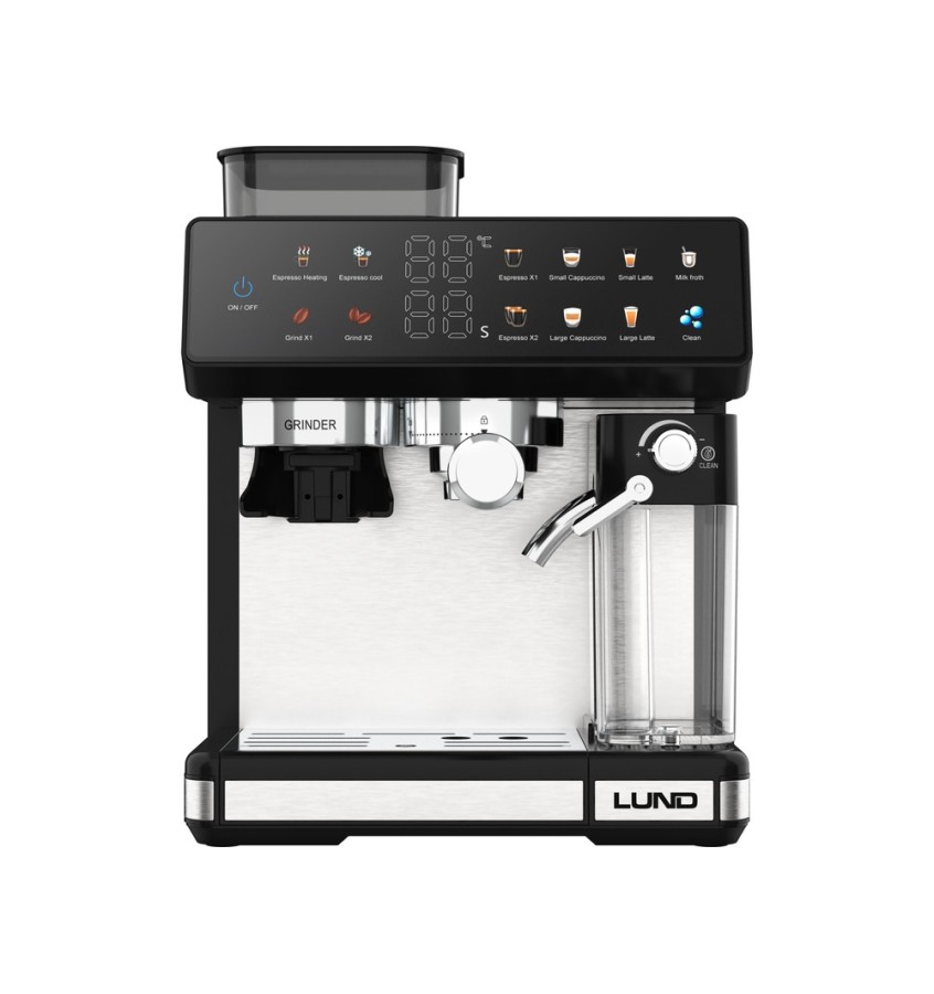 Ekspres ciśnieniowy z młynkiem żarnowym i spieniaczem LUND 68501 to połączenie nowoczesnego, stalowego designu z funkcjonalnością. Oferuje 11 automatycznych programów, umożliwiając przygotowanie zarówno klasycznego espresso, jak i mlecznych specjałów – szybko, wygodnie i zawsze z powtarzalnym efektem. Kolorowy, dotykowy panel sterowania sprawia, że wybór napoju i obsługa urządzenia są szybkie i intuicyjne, a system Thermoblock i pompa 20 bar gwarantują stabilną ekstrakcję i szybką gotowość do pracy. Dodatkowo ekspres wyposażono w automatyczny program czyszczenia i duże, łatwe do mycia zbiorniki na wodę i mleko, co upraszcza codzienną obsługę.