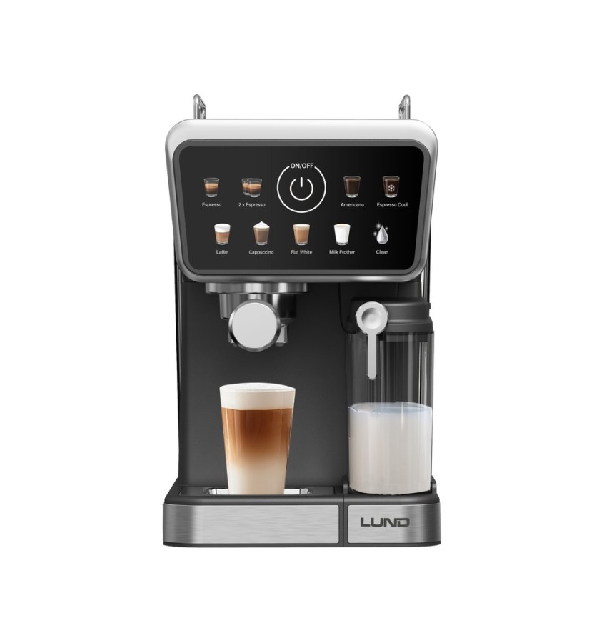 Ekspres ciśnieniowy LUND 68502 9 w 1 to wszechstronne urządzenie pozwalające cieszyć się kawą dopasowaną do nastroju i pory dnia. Umożliwia przygotowanie nie tylko klasycznego espresso czy cappuccino, ale także latte, flat white, americano, orzeźwiającego cold brew oraz napojów z automatycznie spienionym mlekiem. Dwa rodzaje kolby – do kawy mielonej oraz unikalna na rynku do kawy w kapsułkach Nespresso®, Starbucks® i UCC® – łączą swobodę wyboru i elastyczność w codziennym użytkowaniu.