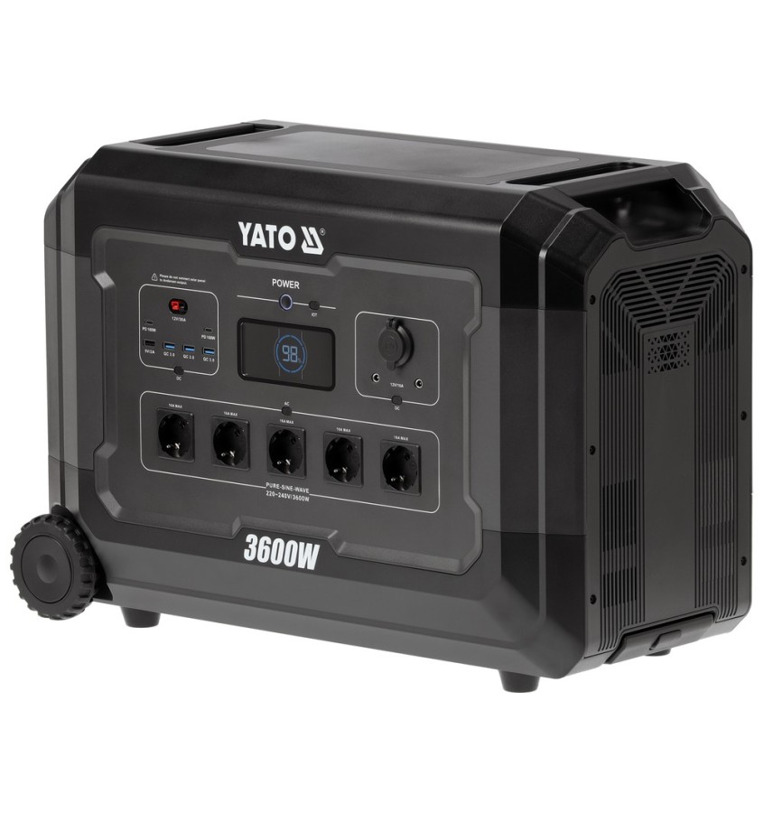 Przenośna, zaawansowana stacja zasilania YATO o bardzo dużej pojemności 3072 Wh i mocy wyjściowej 3600 W, wyposażona w nowoczesny akumulator LiFePO4, została zaprojektowana jako stabilne i długoterminowe źródło energii do wymagających zastosowań. Technologia litowo-żelazowo-fosforanowa zapewnia ponadprzeciętną żywotność ogniw, wysoką odporność na głębokie rozładowania oraz utrzymanie stałych parametrów pracy, nawet przy długotrwałym i intensywnym obciążeniu. Tak duży zapas energii pozwala zasilać zarówno elektronikę użytkową i oświetlenie, jak również elektronarzędzia oraz wybrane urządzenia AGD, bez konieczności częstego uzupełniania energii.