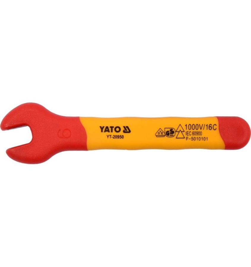 Izolowany klucz płaski marki YATO YT-20950. Wykonany z wytrzymałej, narzędziowej stali chromowo-wanadowej CrV. Wielokomponentowa rękojeść z certyfikatem VDE zapewnia izolację do 1000 V, dzięki czemu narzędzie może być stosowane podczas pracy przy instalacjach niskonapięciowych
