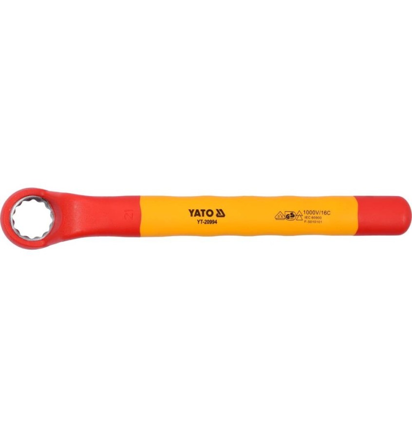 Izolowany klucz oczkowy odgięty marki YATO YT-20994. Wykonany z wytrzymałej, narzędziowej stali chromowo-wanadowej CrV. Wielokomponentowa rękojeść z certyfikatem VDE zapewnia izolację do 1000 V, dzięki czemu narzędzie może być stosowane podczas pracy przy instalacjach niskonapięciowych.