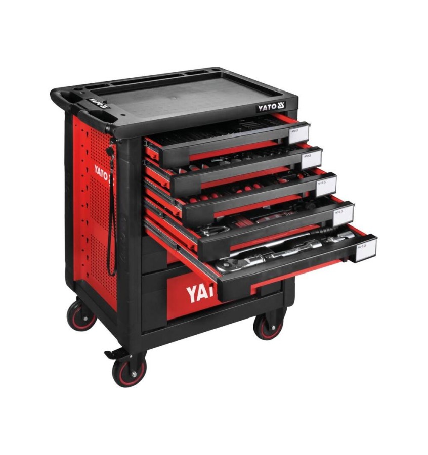 Szafka narzędziowa marki YATO. Wyposażona jest w 7 szuflad na prowadnicach kulkowych. 5 górnych szuflad zawiera 165 starannie dobranych narzędzi. Profile wykonane są z podwójnej blachy stalowej - uniwersalna perforacja umożliwia doposażenie szafki w dodatkowe elementy. Centralny zamek oraz indywidualne zamykanie każdej szuflady.